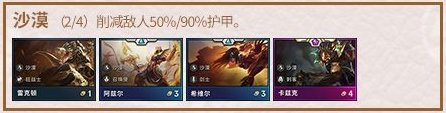 Tips:这套阵容主要靠沙漠buff的穿甲,配合刺客的高爆发,起到刀刀切菜的效果